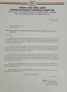 हरियाणा प्रदेश कांग्रेस कमेटी (HPCC) ने चंडीगढ़ स्थित पार्टी मुख्यालय की सुरक्षा को लेकर चिंता जताते हुए हरियाणा पुलिस महानिदेशक (DGP) को पत्र लिखा है। पत्र में मुख्यालय की सुरक्षा व्यवस्था मजबूत करने और प्रदेशाध्यक्ष के लिए अतिरिक्त सुरक्षा उपलब्ध कराने की मांग की गई है।