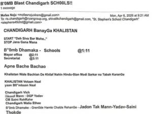 ईमेल में लिखा गया कि मुख्यमंत्री सैनी चंडीगढ़ में रहते हैं और यहां बम धमाके और ग्रेनेड हमले जारी रहेंगे। साथ ही यह भी कहा गया कि चंडीगढ़ और पंजाब के कई स्कूलों को सोमवार को निशाना बनाया जाएगा।
