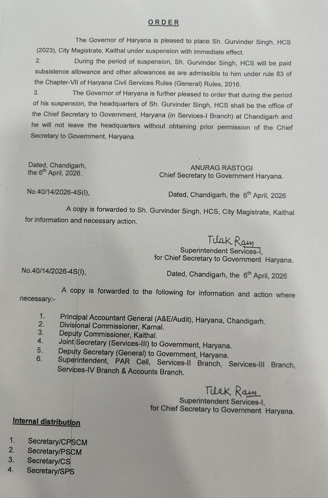 हरियाणा सरकार ने प्रशासनिक स्तर पर बड़ा फैसला लेते हुए कैथल के सिटी मजिस्ट्रेट गुरविंदर सिंह को तत्काल प्रभाव से निलंबित कर दिया है। जारी आधिकारिक आदेश के अनुसार राज्यपाल की स्वीकृति के बाद यह कार्रवाई अमल में लाई गई है और आदेश 6 अप्रैल 2026 को चंडीगढ़ से जारी किया गया। आदेश में स्पष्ट किया गया है कि निलंबन अवधि के दौरान संबंधित अधिकारी को नियमानुसार जीवन निर्वाह भत्ता और अन्य अनुमन्य भत्ते दिए जाएंगे।
