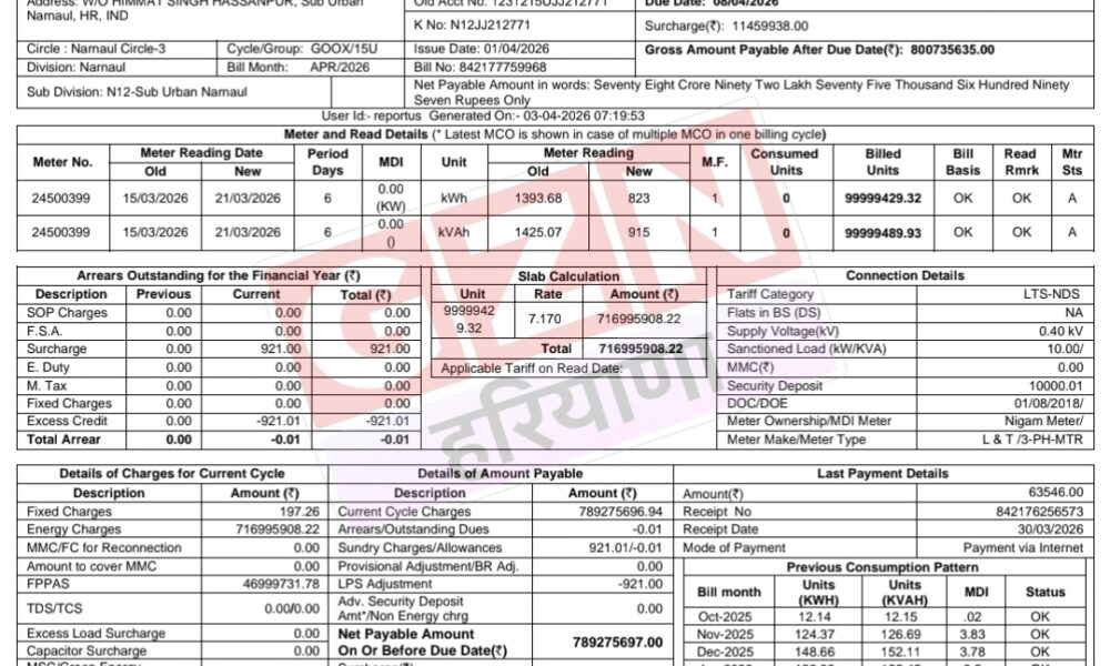 हरियाणा के नारनौल से सामने आया एक चौंकाने वाला मामला अब राष्ट्रीय स्तर पर चर्चा का विषय बन गया है। दक्षिण हरियाणा बिजली वितरण निगम (DHBVN)...